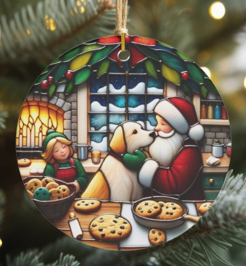 🐶Inside the cozy interior, Santa Claus, dressed in his signature red outfit, spends time with a loyal golden retriever as the two exchange affectionate glances. A happy child looks on as her basket is filled with freshly baked cookies.