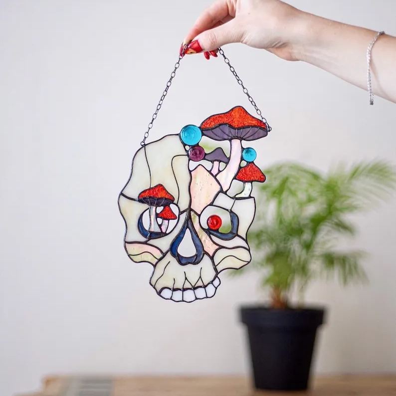 We're already getting ready for Halloween and we know you love our stained glass suncatchers too.💀 The beautiful split skull filled with fascinating mushrooms. Extraordinary design for Halloween and gifts for it.🍄