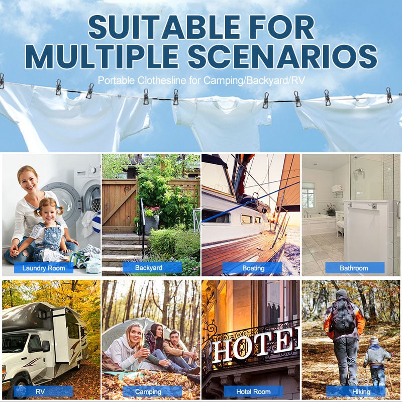 🍀Attaches Everywhere: Easy to fasten with two strong metal hooks. Portable travel clothesline can be fixed anywhere: hotel, bathroom, backyard, laundry room, RV, boat, balcony, or even fixed on trees.