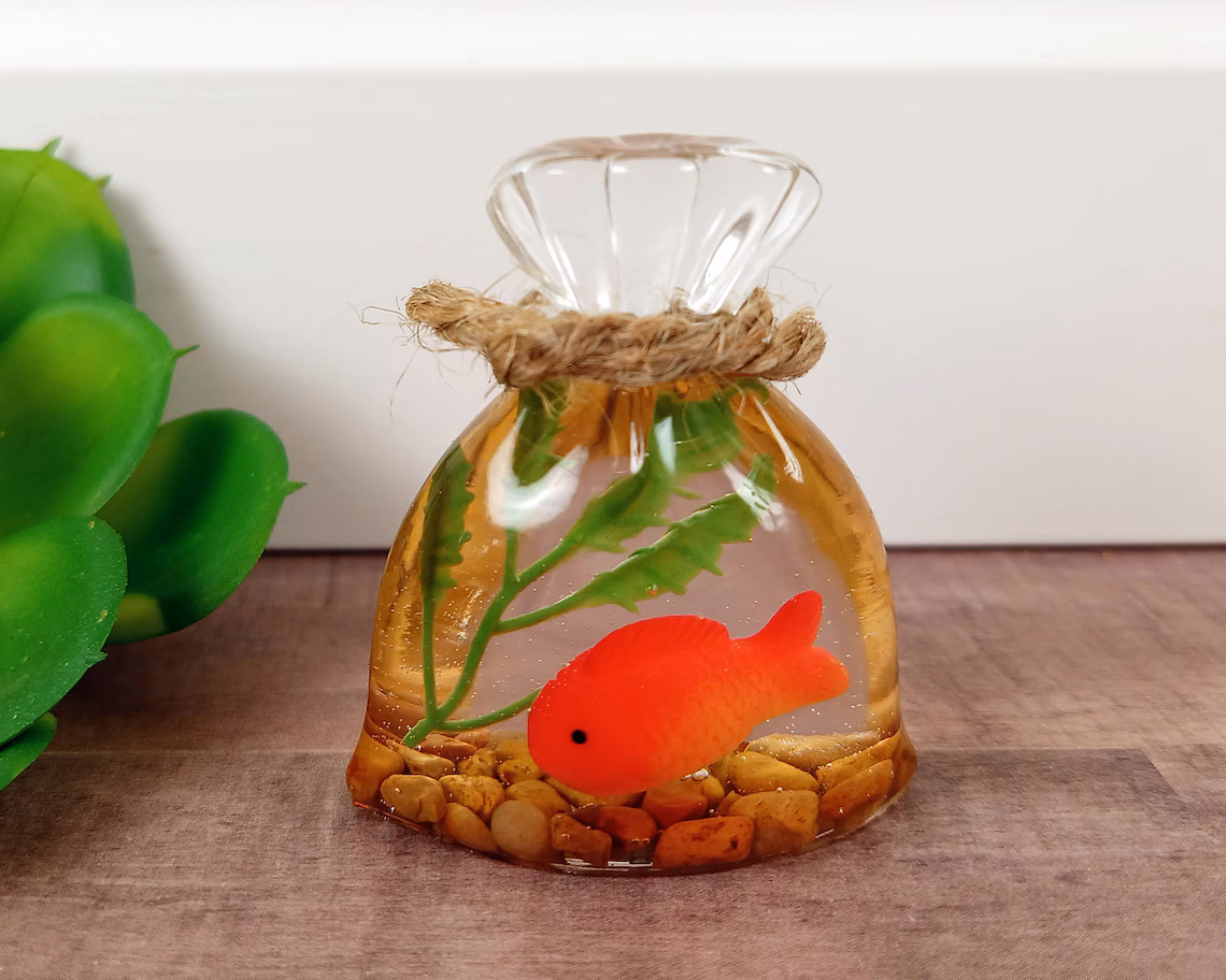 Suspended within are tiny goldfish, each one unique and bursting with personality. Their vibrant colors and graceful movements add a touch of magic to your ensemble.